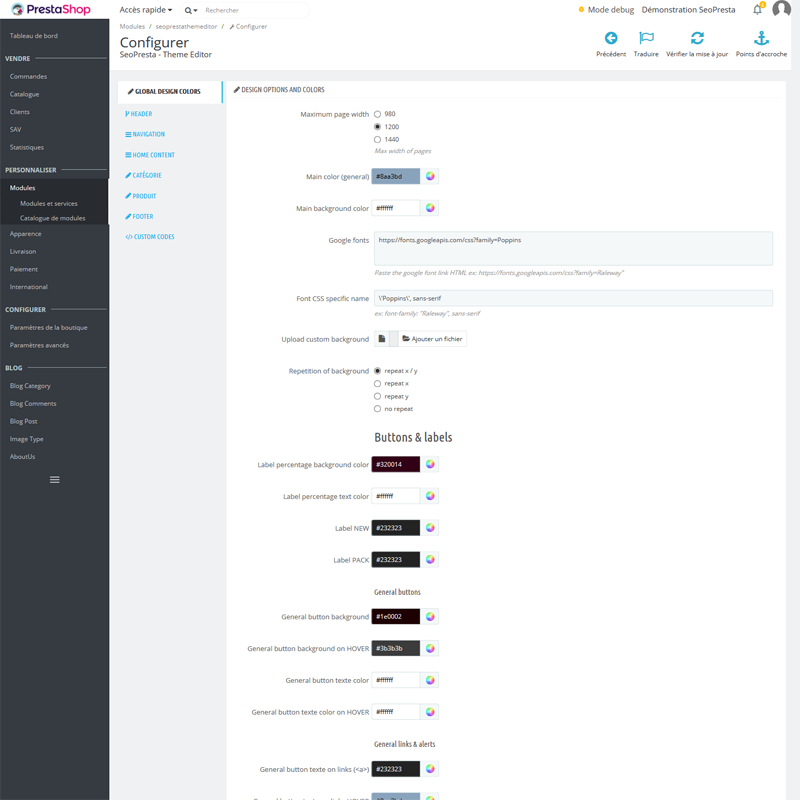 - SeoPresta Thème Editor : module dédié à la personnalisation du thème