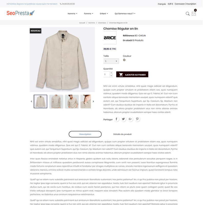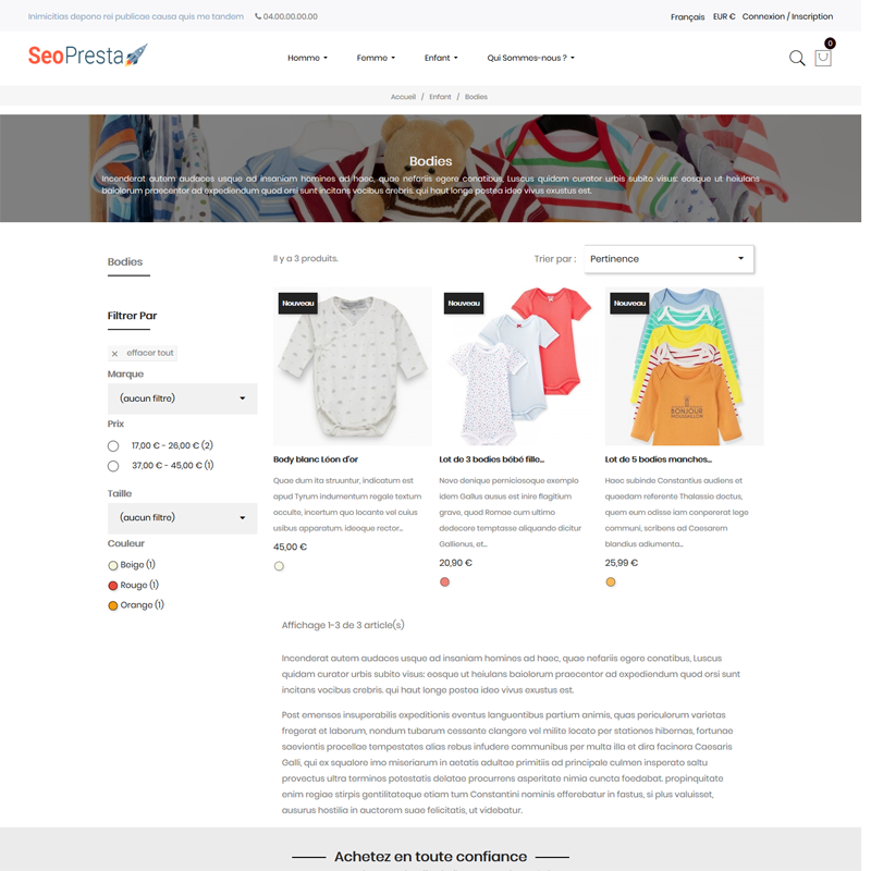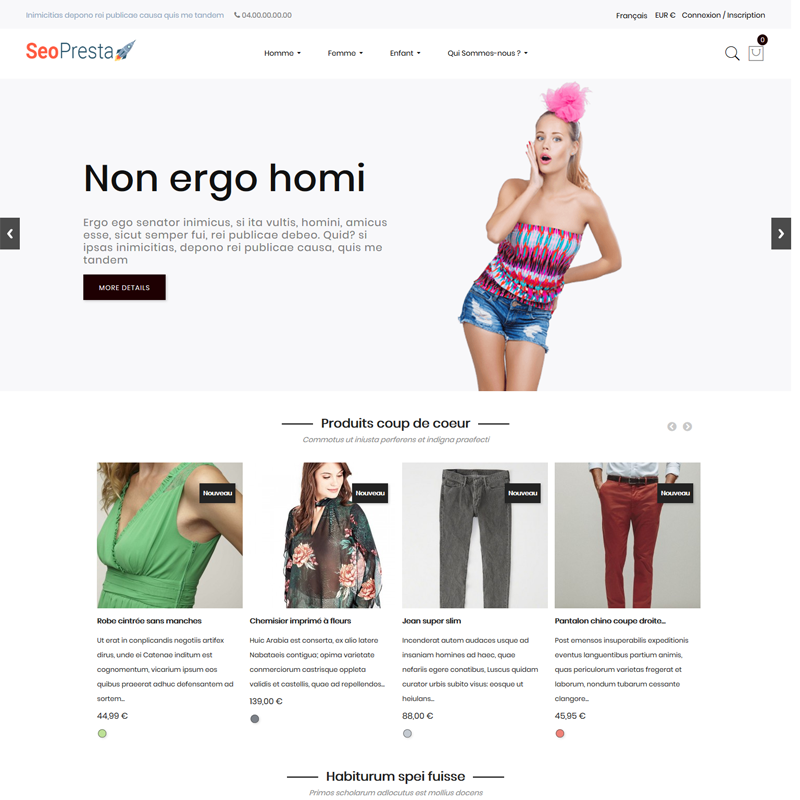 Le premier thème 100% SEO pour PrestaShop, anciennement nommé « SeoPresta », qui a connu un fort succès. Aujourd’hui il est remplacé par Fashion SEO, un nouveau thème PrestaShop encore plus complet et optimisé pour le SEO et l’UX.